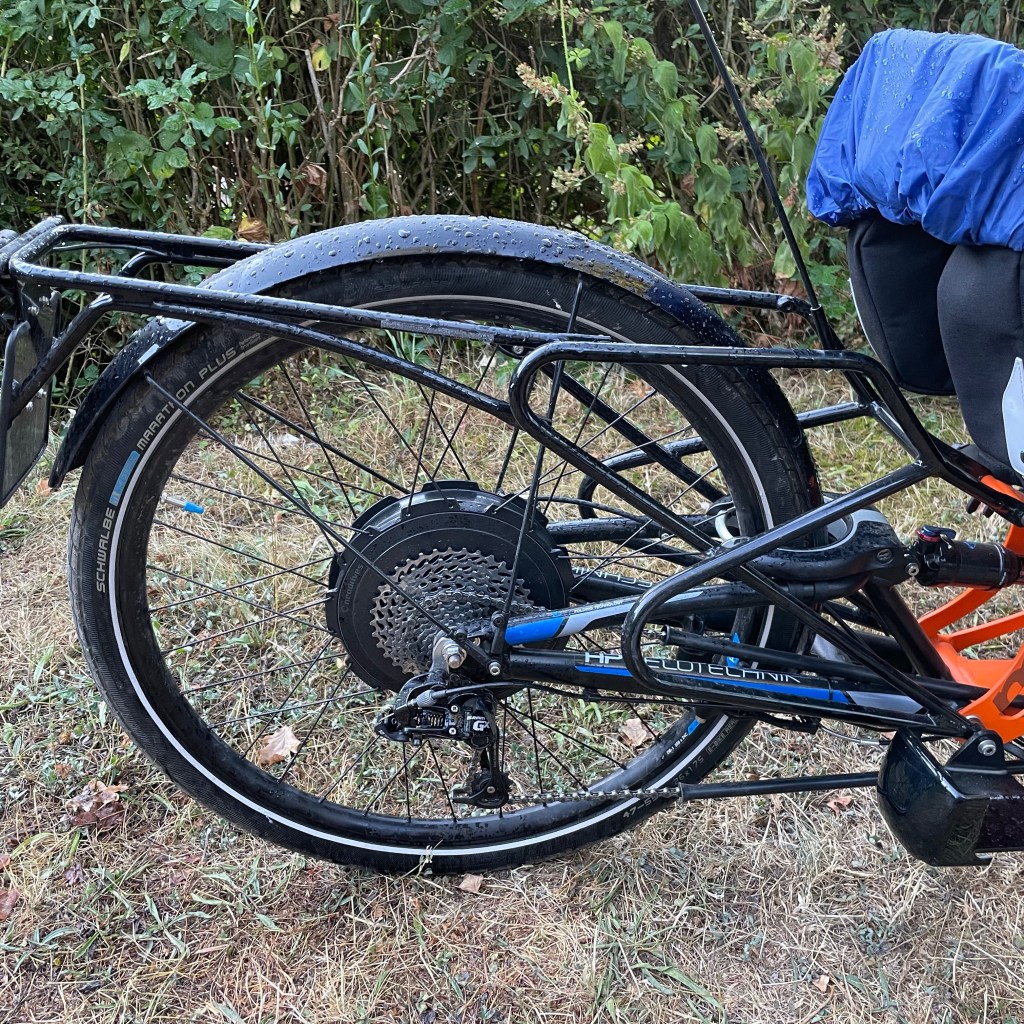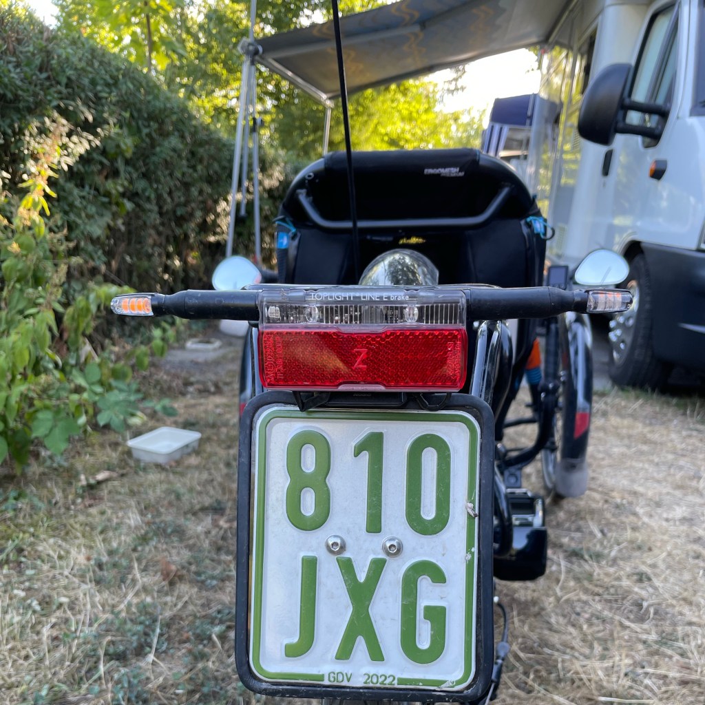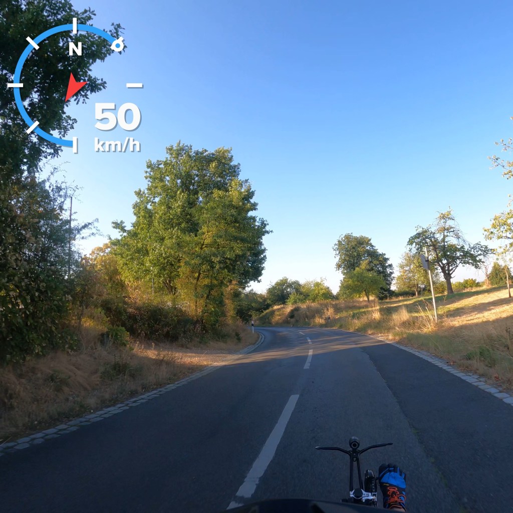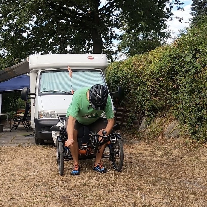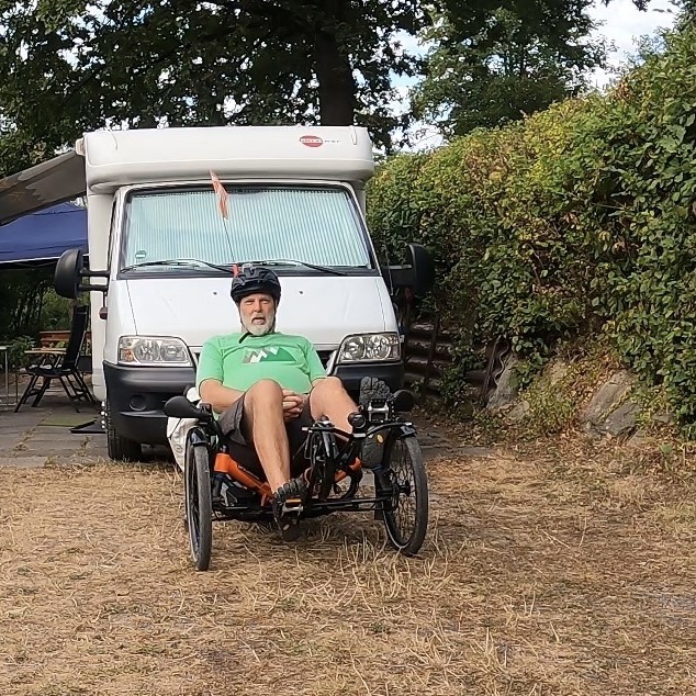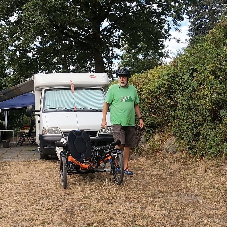 Jetzt aber los, ich will erst mal fahren. Einschalten, Beine hoch und los gehts. Fühlt sich an wie beim Kardiologen, Belastungs-EKG. Ein paar Schlenker zum Üben auf dem Hof, dann ab auf die Strasse und in Richtung Sommerdomizil, dem Camper auf dem Platz von „The Eppstein Project“, etwa 15 km Strecke fürs Erste.
