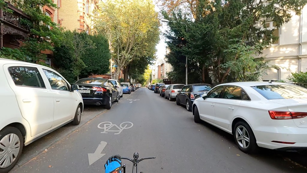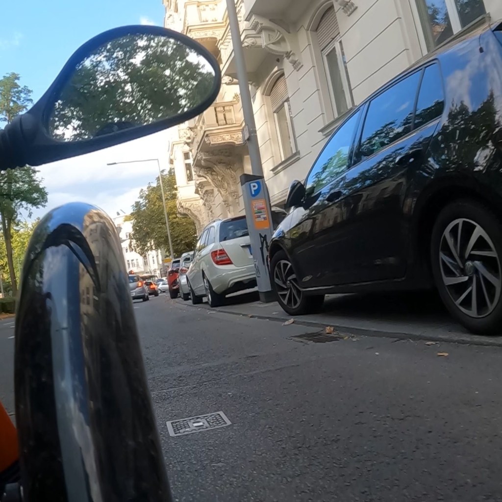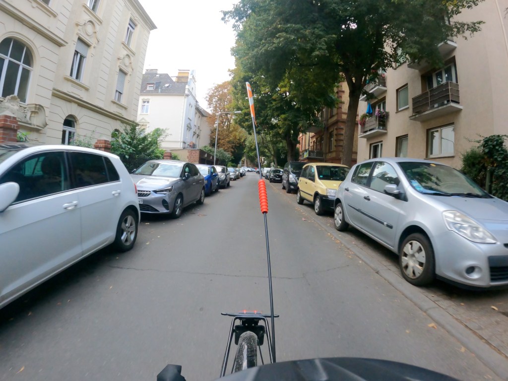 Mit parkenden Autos sieht es anders aus, keine Chance, zu sehen, ob jemand drin sitzt und gleich aussteigen will oder nicht. Ab jetzt ist die Strassenmitte mir. Und es funktioniert, sie lassen mich. Auch Kreuzungen, Ausfahrten und rechtsvorlinks haben ihre Tücken, aus der Sicht von Unten wirkt die Stadt noch zugestellter als aus der Perspektive des Fussgängers.