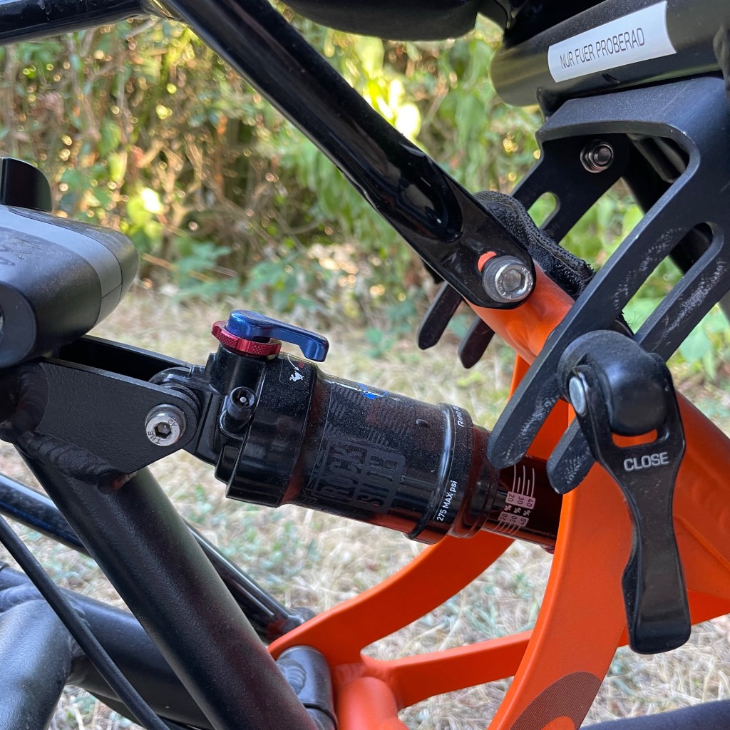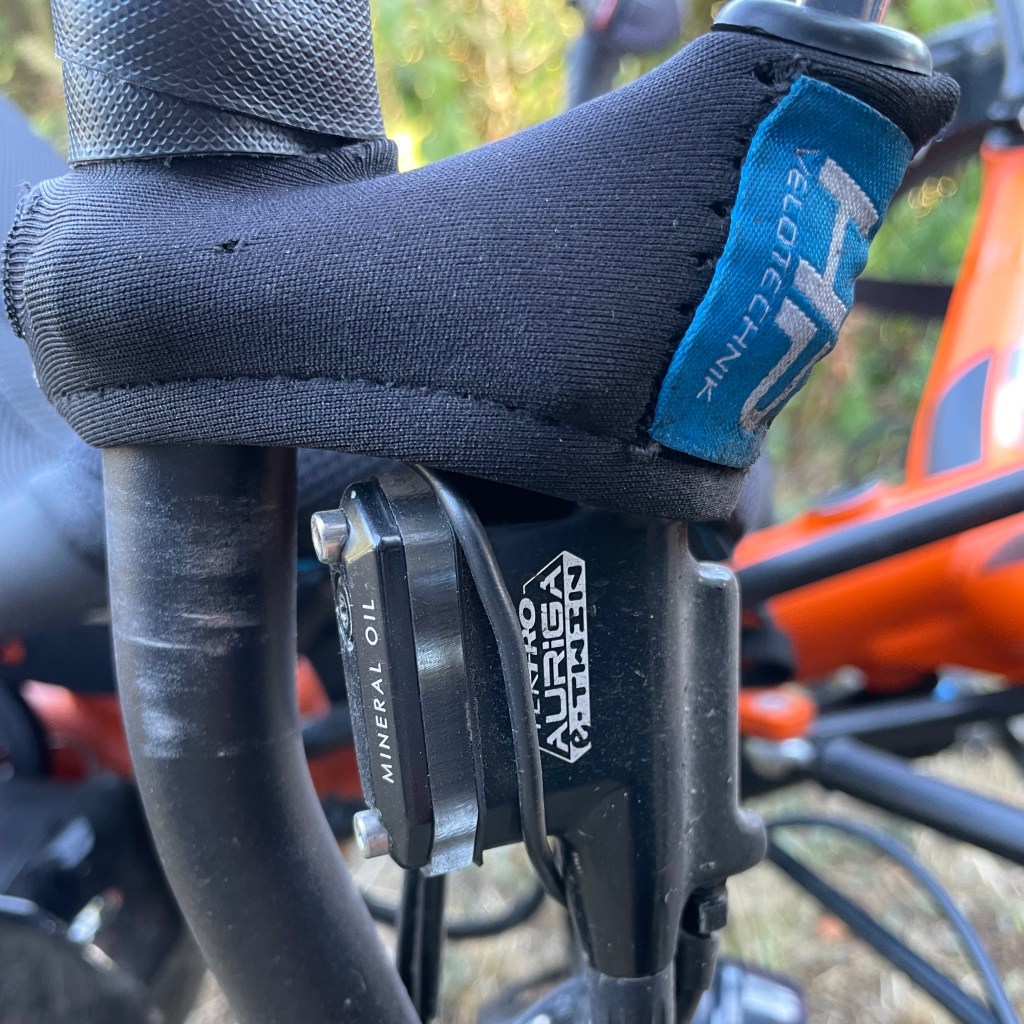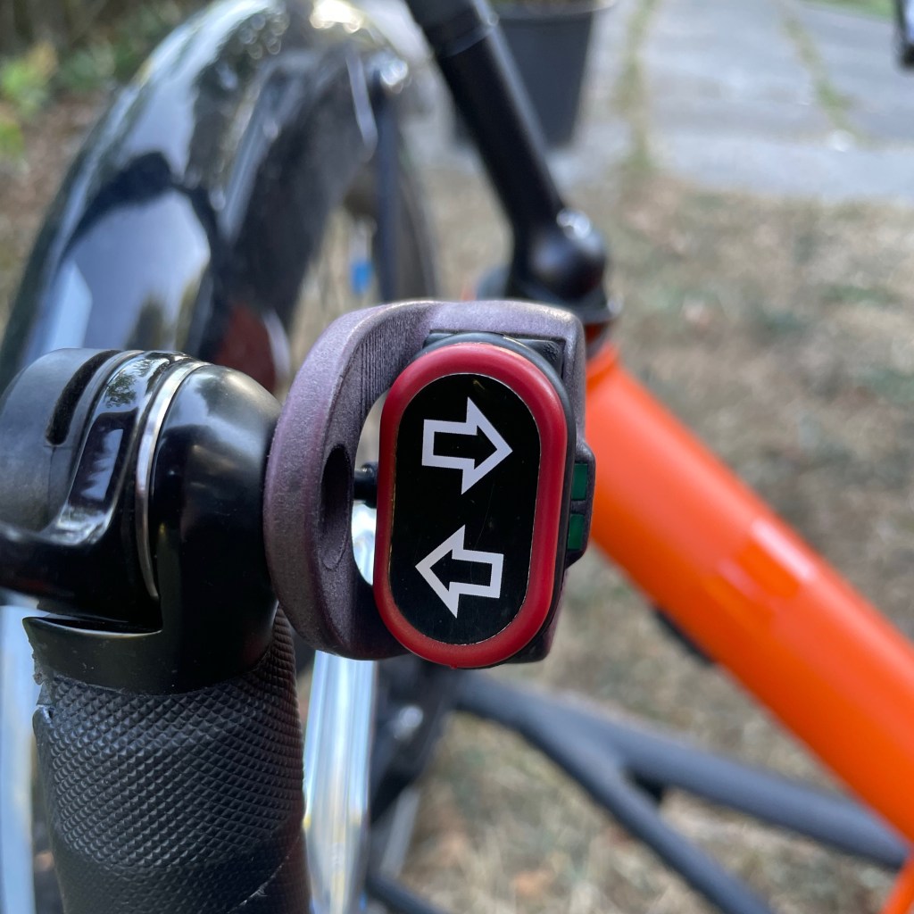 Der Lenker geht unter mir durch. Wenn ich die Arme einfach locker fallen lasse, kann ich sehr bequem die Lenkerenden fassen. Links Blinkerschalter mit Kontrollleuchten, Hinterradbremse und Lenkerendhebel für den Umwerfer. Rechts Display, Motorsteuerung, Vorderradbremsen ( der Motorradfahrer in mir dankt es ) und Lenkerendhebel für die Kettenschaltung. Mit ein paar Verrenkungen lässt sich der Stand der Bremsflüssigkeit im vorgeschriebenen Schauglas an den Handbremszylindern sehen….. Hä?