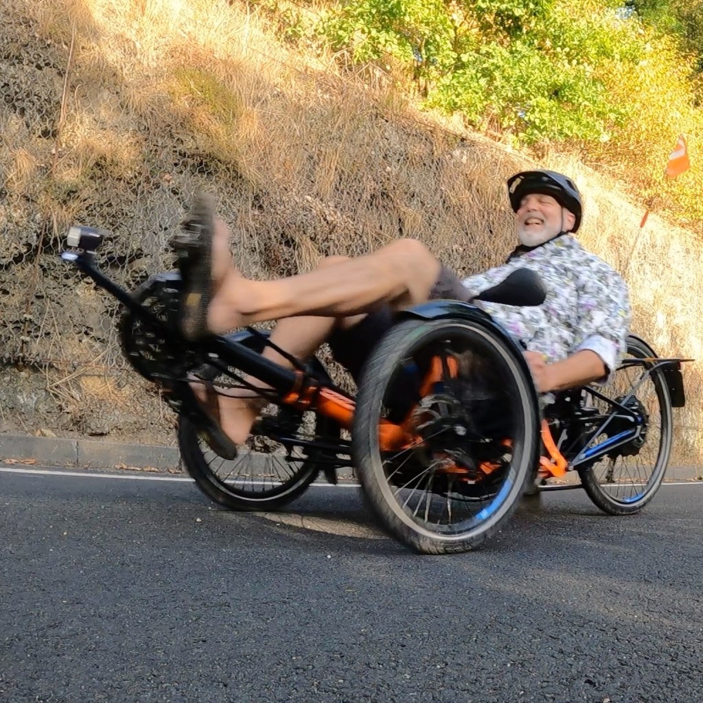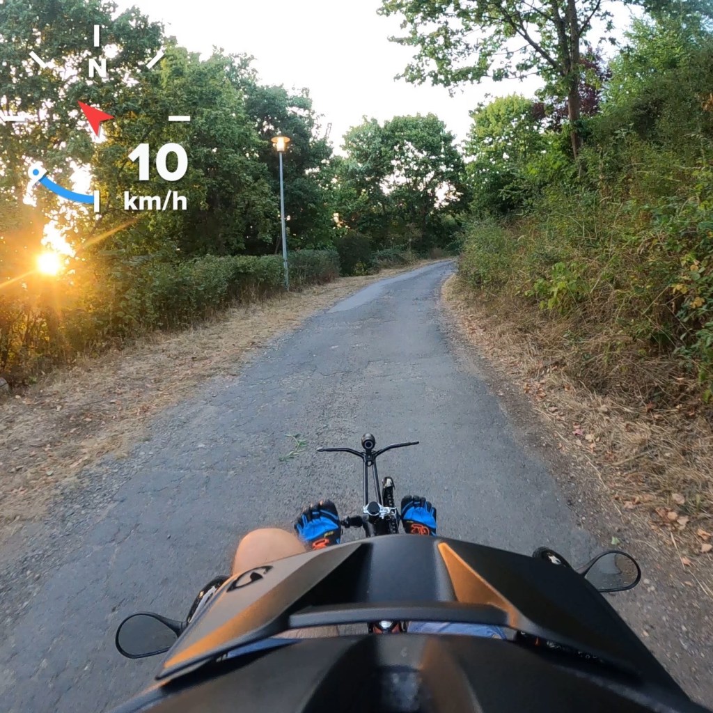Landstrasse, hier sieht es ganz anders aus. Inzwischen habe ich mich an die Sitzposition gewöhnt, liege bequem im voll verstellbaren und individuell auspolsterbaren Komfortsitz, vermisse keine Kopfstütze. Geradeauslauf und Federung sind für ein Dreirad perfekt und zeugen von einem riesigen Erfahrungsschatz bei Konstruktion und Einstellung der Fahrwerksgeometrie. Der Blick geht nach vorne oben, vor mir die Strasse, oben ziehen die Bäume vorbei, freier Blick zum Himmel. Die Reifen spielen ihr Lied, ich fliege……….