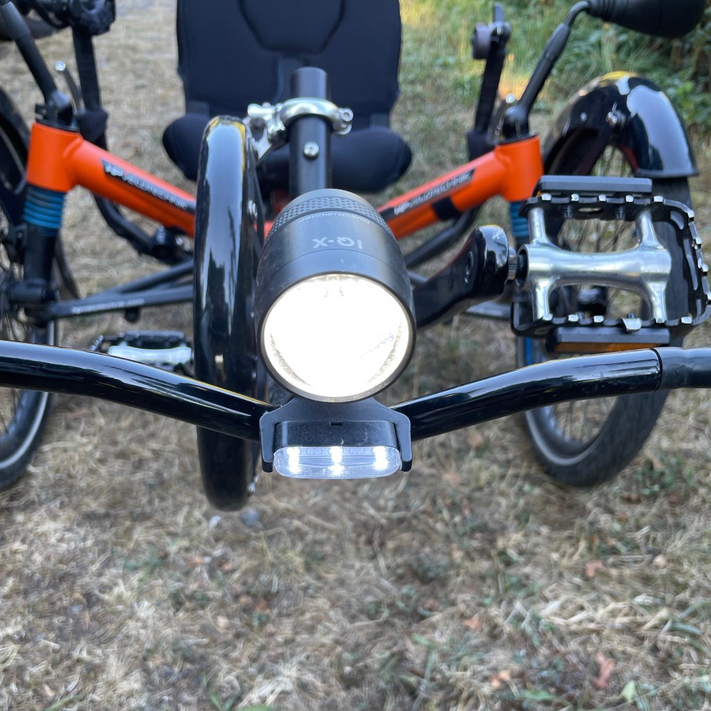 Vor mir ragt die Kurbelgarnitur mit 3er- Kettenblättern auf. Davor – wie ein Rammbügel – die Halterung für Licht, Positionsleuchte ( richtig gelesen, der TÜV schreibt bei dreirädrigen Kraftfahrzeugen so was vor ) und die Blinker.